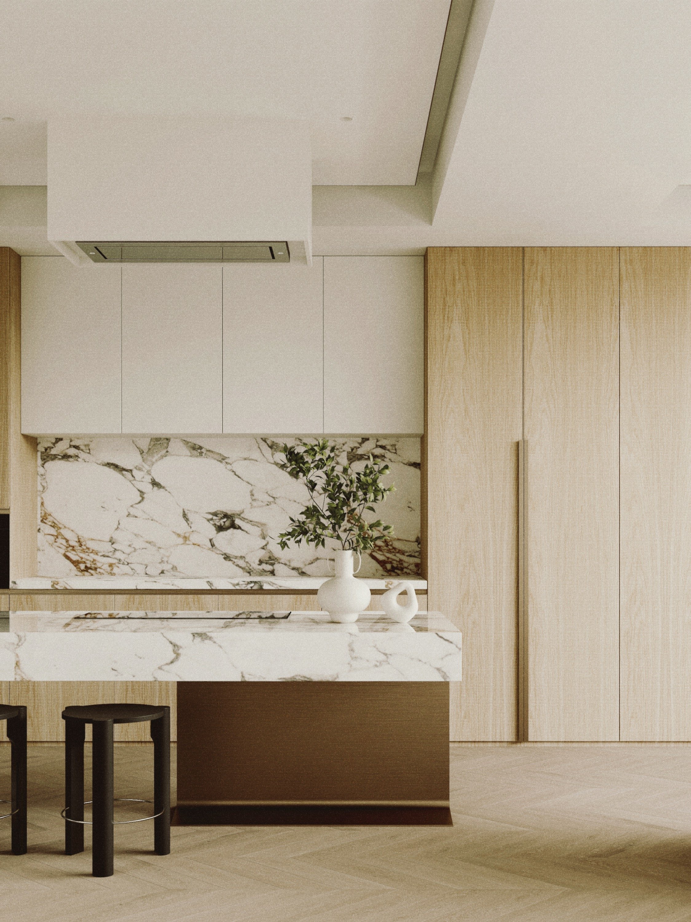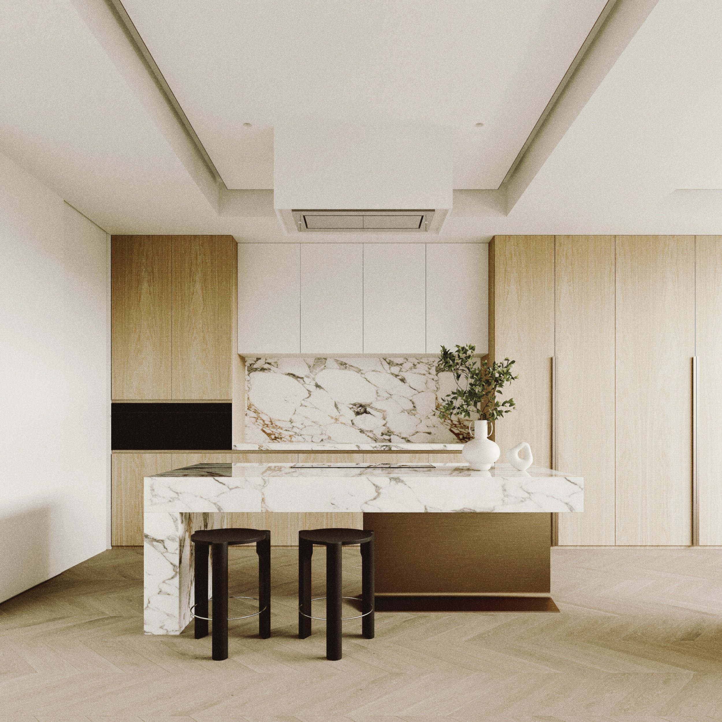 Natural timber, stone, and fabric tones bring a relaxed and timeless feel, while subtle details such as curved joinery and a calm neutral palette create a space that feels both refined and livable.